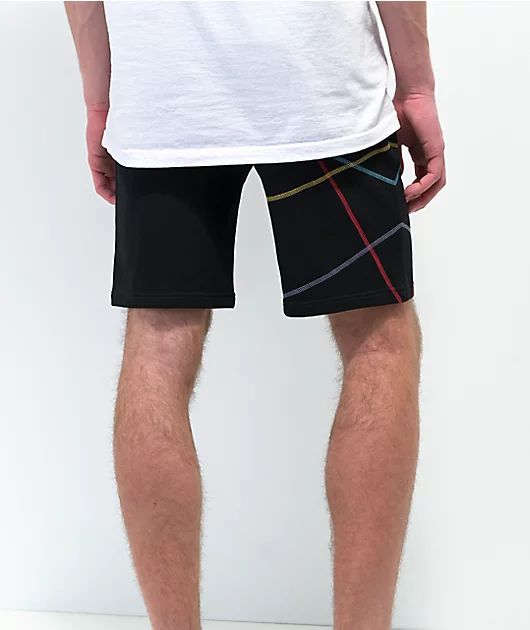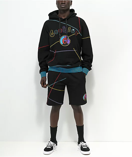 The Show N Prove black sweat shorts from Cookies come in a black colorway with a black and blue stripped waistband, an embroided brand patch on the left leg, and colorful stitching throughout the right leg. These shorts also feature a ribbed, elastic wais