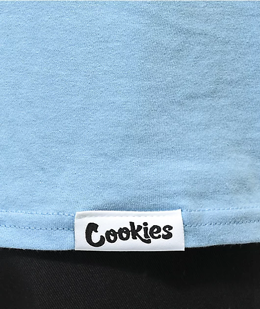 The Triple Beam t-shirt from Cookies comes in a powder blue colorway with screen-printed, diagonal Cookies logos throughout the chest. This shirt also features a ribbed collar and an embroidered patch of the brand name along the bottom hem.