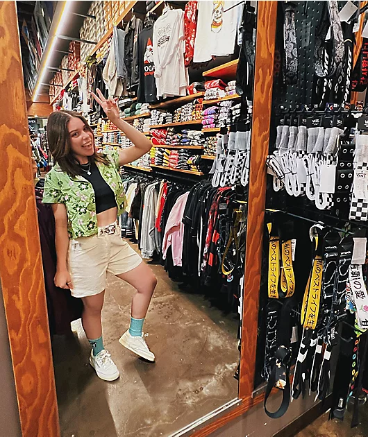 The Sadie button up long sleeve shirt by Daisy Street comes in a Hibiscus Green cropped construction, with sublimated pink and green smiling flowers sublimated throughout. The slightly boxy, cropped floral shirt has a straight bottom hem, rolled arm sleev