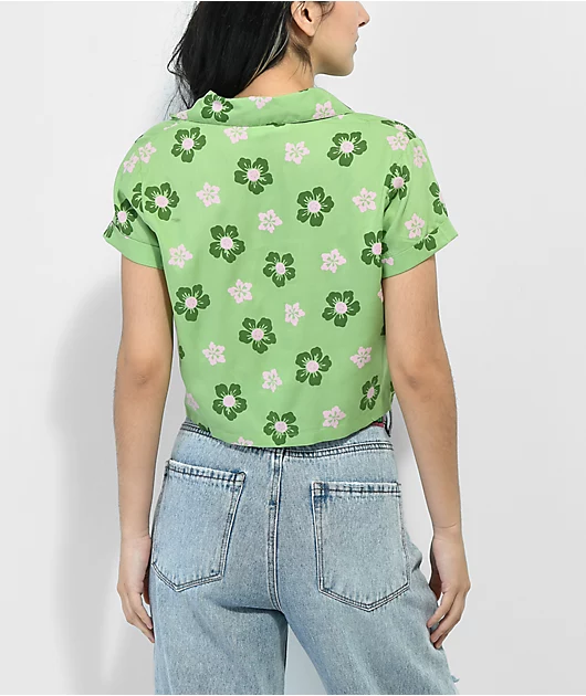 Daisy Street Sadie Hibiscus Green Button Up Short Sleeve Crop Shirt