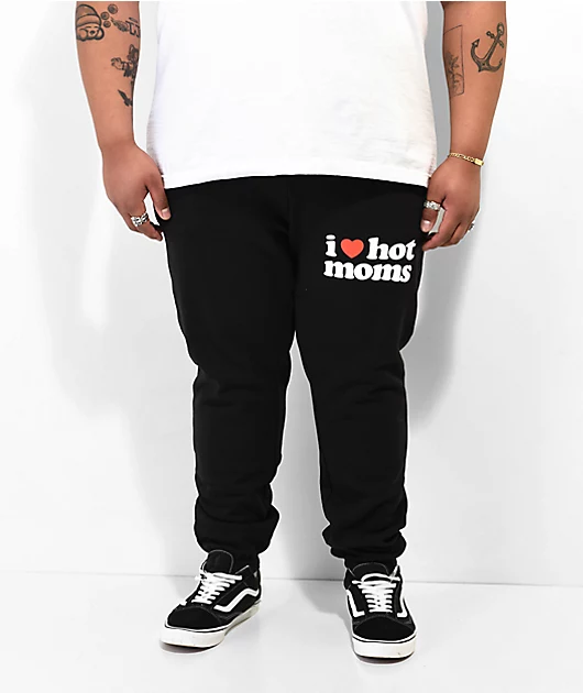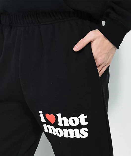 The I Heart Moms sweatpants from Danny Duncan come in a black colorway with script reading, \”I heart moms\” screen-printed down the left leg; perfect for boasting your dating preferences. These sweatpants feature a drawstring-adjustable waistband with elas