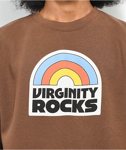 From Danny Duncan comes the Virginity Rocks Aviator crewneck sweatshirt in a brown colorway, adding pops of color with a screen printed graphic of a rainbow across the chest with joining script that reads \”Virginity Rocks\”. This pullover sweatshirt is mad