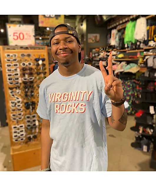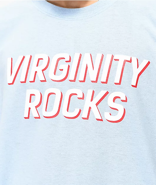 Save yourself for the Danny Duncan Virginity Rocks Light Blue T-Shirt. This mostly light blue shirt features screen-printed script across the chest that reads \”virginity rocks\” for a look that is sure to convey your angelic demeanor.