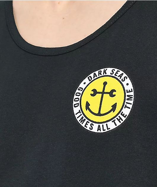 From Dark Seas comes the Good Vibes tank top in the black colorway. This soft cotton tank top features a yellow nautical anchor design screen-printed on both the left chest and back, with script reading: \”Dark seas | Good times all the time.\”