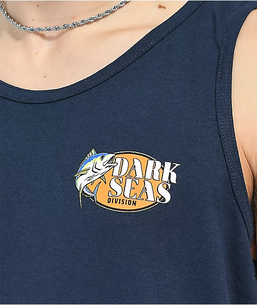 The Long Range Dark Seas tank top has a soft, 100% cotton construction and comes in a navy colorway with a screen-printed graphic of the brand logo in orange on the left side of the chest and on the back.