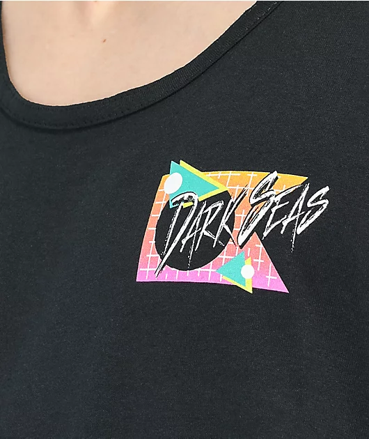 The Wet N Wild Dark Seas tank top comes in a black colorway with a screen-printed graphic on the front of an 80’s-inspired brand logo and on the back of script reading, \”Wild n wet\” above a graphic of a woman on a jet ski. This tank top is made of 100% co