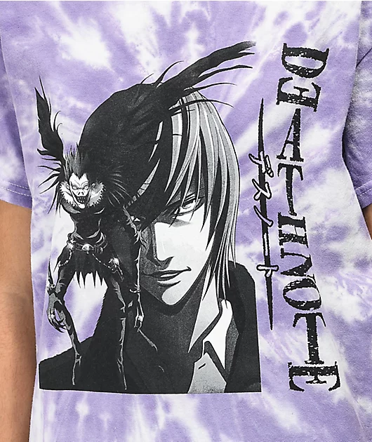 The Death Note Light & Ryuk purple tie dye t-shirt gives any outfit an anime accent. This Death Note t-shirt features a large graphic of Light at the center chest, with the haunting Ryuk on his shoulder, giving plenty of contrast against the purple-and-wh