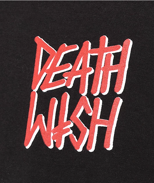 This The Truth Deathwish t-shirt is made of 100% cotton and comes in a black colorway with a screen-printed brand logo in red on the left of chest with the \”I\” from the logo blown up large on the back for bold branding.
