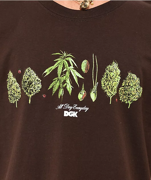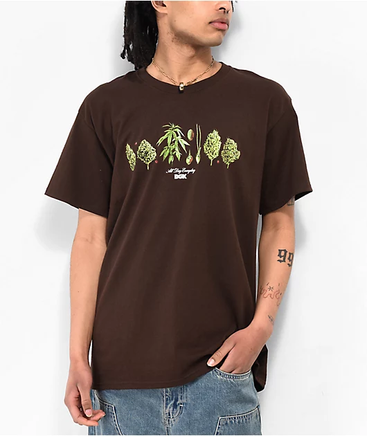 DGK brings the Botanical Society t-shirt in a brown colorway, adding pops of color in green with screen-printed graphics of marijuana plants at various stages of growth development. On the back of this graphic tee is a graphic of a momma marijuana plant s