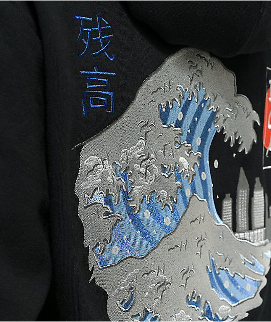 The Breaker DGK hoodie comes in a black colorway with embroidered Japanese-inspired graphics and script throughout including the brand name on the front, Japanese characters on the left forearm, and a large image of a wave passing near a city on the back.