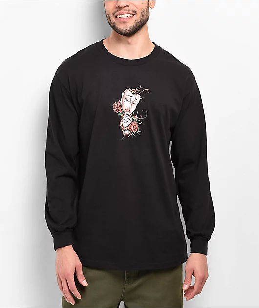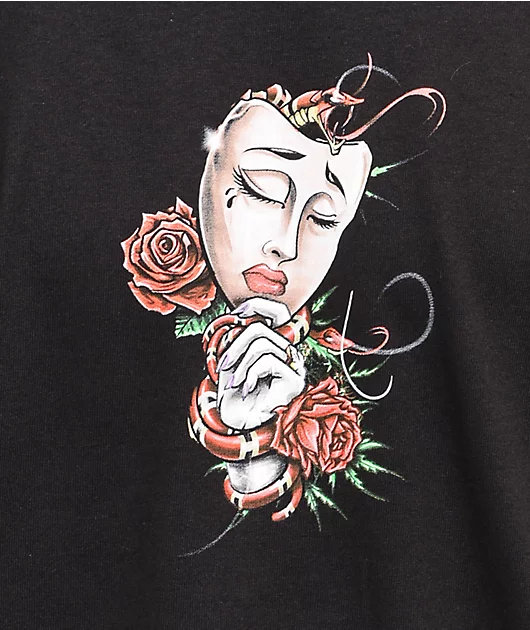 The Califia t-shirt from DGK comes in a long sleeve construction with a black colorway, adorned with a screen-printed theater mask covered in snakes on the front and a back graphic of a Medusa figure holding the mask.