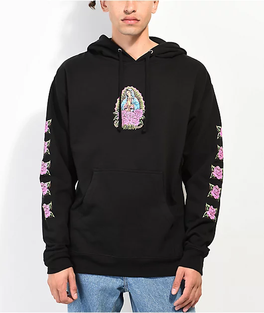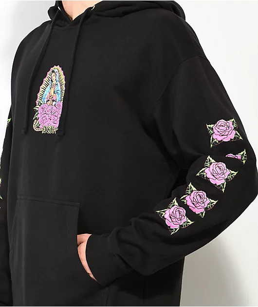 Go in peace with the Day Glo hoodie from DGK coming in a black colorway. A colorful graphic of the Virgin Mary can be seen on the chest, as well as the back but in a larger format. Down both sleeves are bright pink roses that go hand in hand with the rest