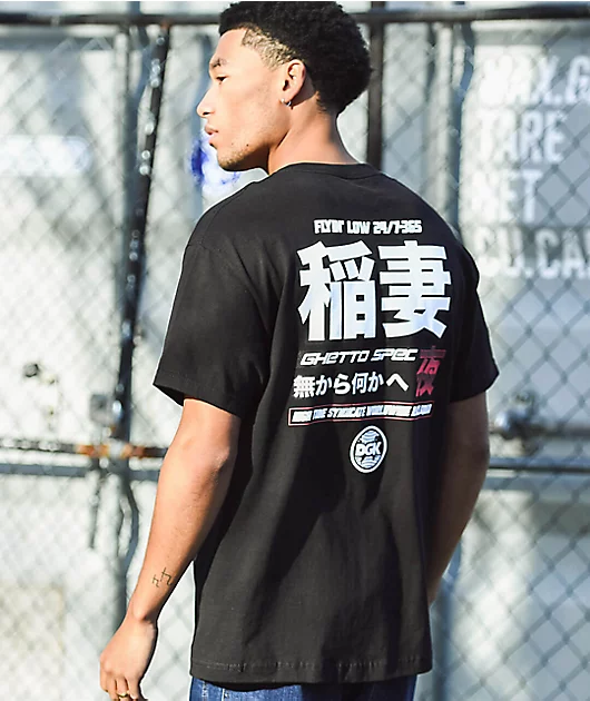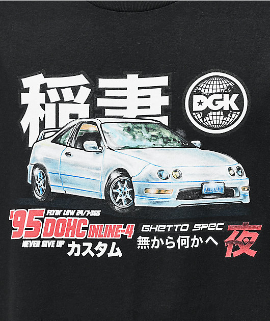 Rev up your skate-inspired style with the DGK Ghetto Spec black t-shirt. This classic black tee features a mixture of Kanji script detailing throughout the chest and back for fashion-forward vibes, while the JDM car printed on the chest offers some additi