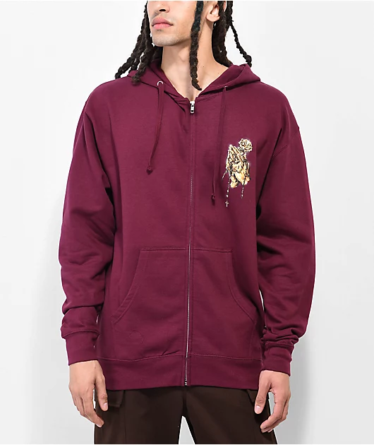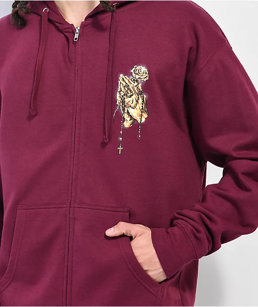 From DGK comes the Golden Blessings Zip Hoodie in a burgundy colorway. Left of chest is the screen-printed image of praying hands, holding a rose between them with rosery beads wrapped around. On the back is the same image on a larger scale for all to see