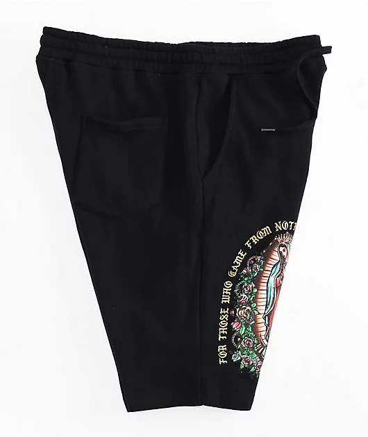 The Guadalupe sweat shorts from DGK come in a black colorway with images of the Virgin of Guadalupe and a rose screen-printed onto the legs for a spiritual fit. These cotton-poly shorts have a drawstring-adjustable waistband with dual slash hand pockets a