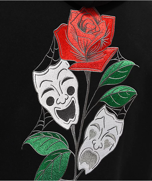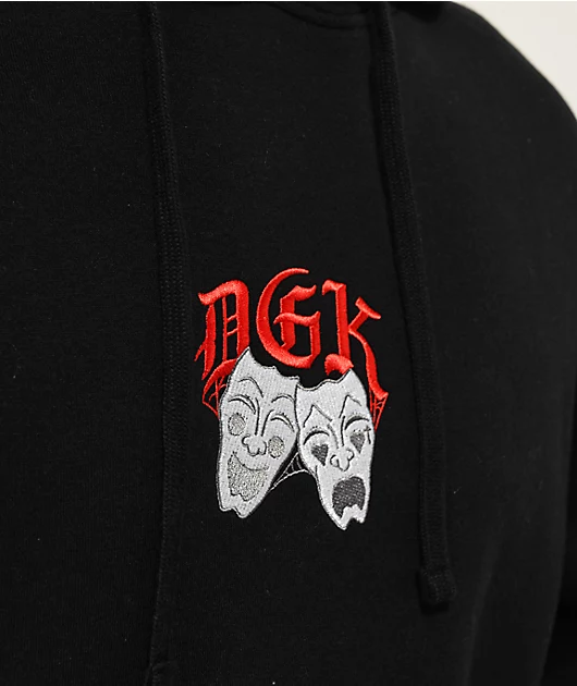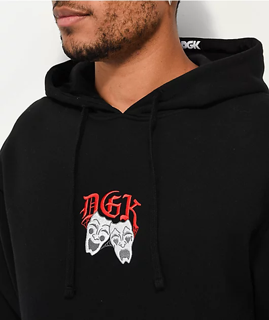 From DGK Skateboards comes the Laugh Now hoodie in a black colorway constructed from a soft cotton-poly blend. The hoodie boasts embroidered logo script at the chest with graphics of drama masks, while the same embroidered graphic resides at the back with
