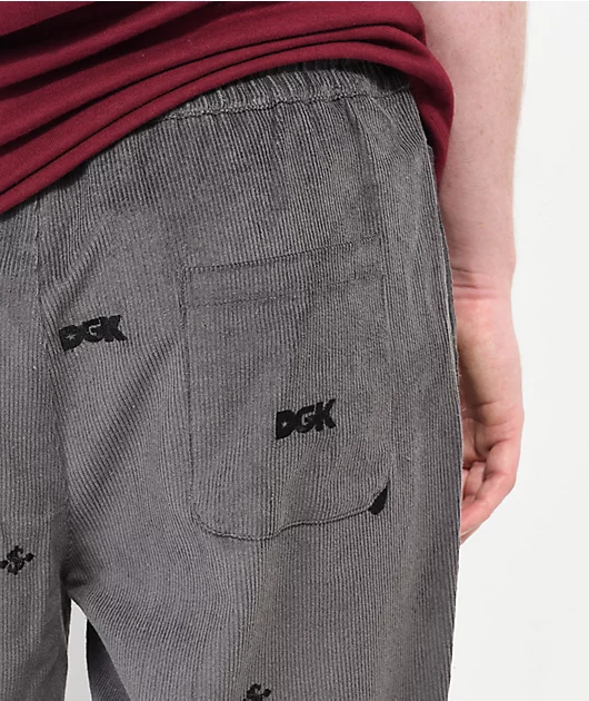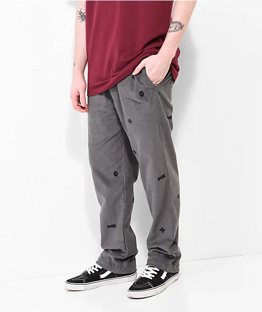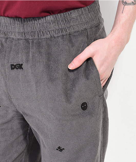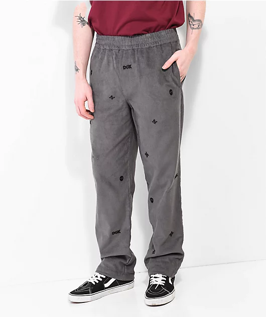 In a charcoal colorway comes the Monogram pants from DGK, offering a classic style with a corduroy construction. These skate pants feature black embroidery throughout of emblems including the DGK logo and a hockey mask, offering a snug fit with an elastic