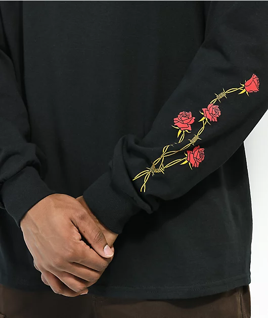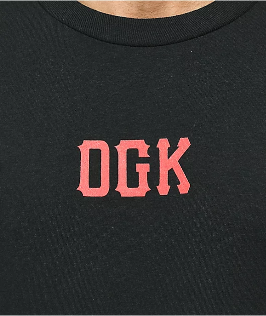 The Ruthless Long Sleeve T-shirt from DGK comes in a black colorway and is constructed using a durable midweight cotton. The shirt features red screen-printed DGK script centered on the chest, roses with barbed wire on the arms, and a bleeding hockey mask