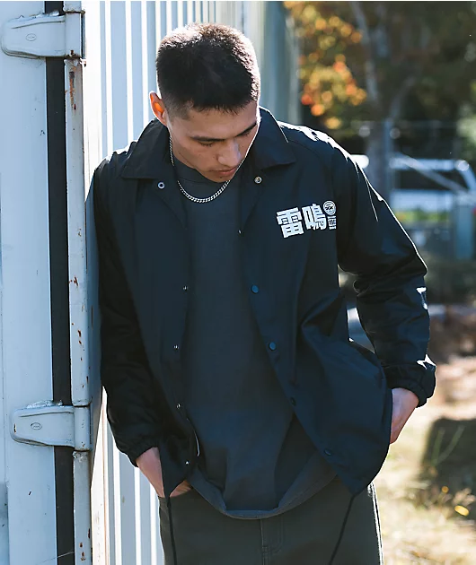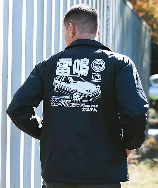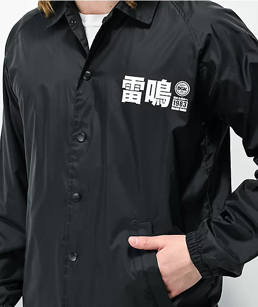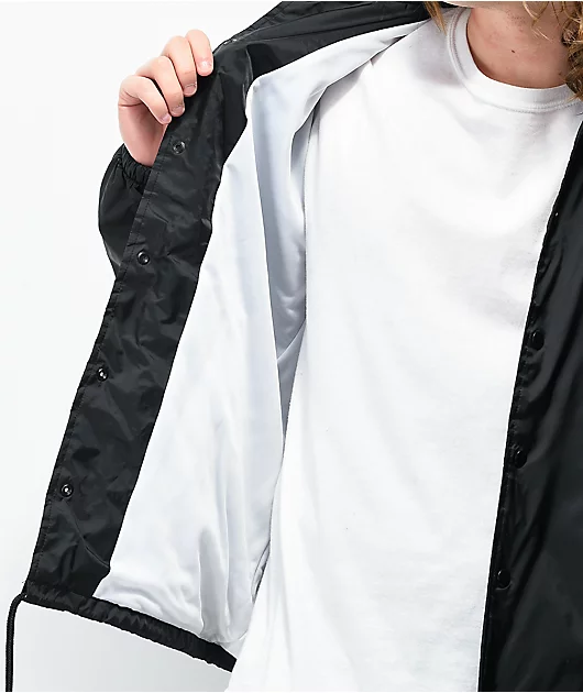 Slide some souped-up, speedy detailing into your wardrobe with DGK’s Tuner black coaches jacket! With a windbreaker-style nylon shell and soft polyester lining, this jacket keeps things toasty warm, while the fold-down collar and button-up placket preserv