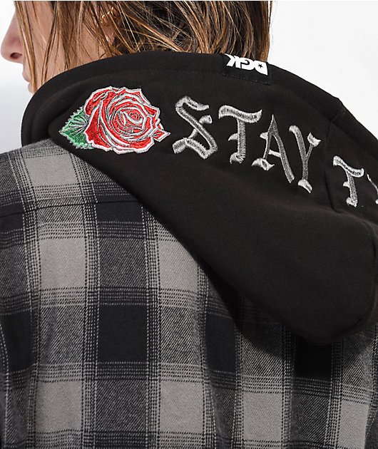 The DGK Undisputed hooded flannel jacket features a black and grey plaid construction a full-zip closure. With a traditional fold down collar, the attached black hood features embroidered roses and text reading \”Stay true.\” With dual chest pockets, slash