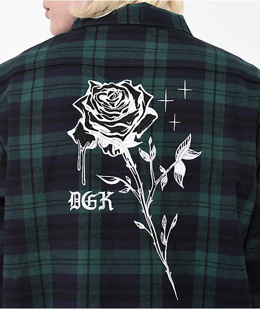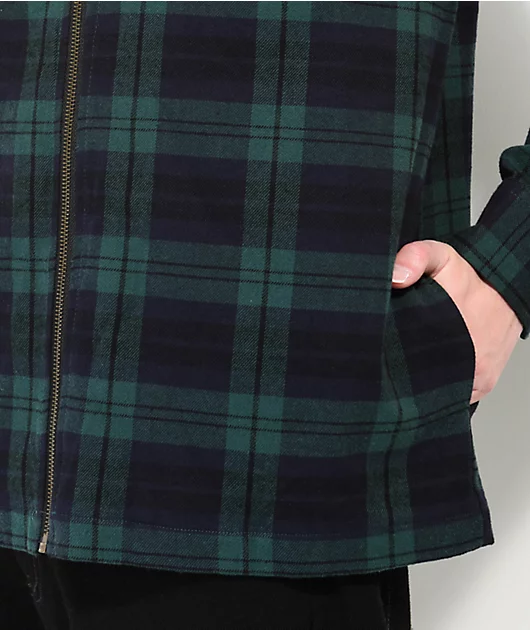 The Virtue flannel shacket from DGK features green and navy plaid patterning throughout with full zip closure and a classic turndown collar. Adorning this shirt jacket is a small brand tag on the dual chest pockets and slash hand pockets for a comfortable