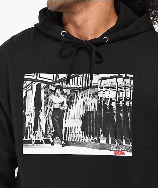 The Reflection hoodie from DGK x Bruce Lee comes in a black colorway with a screen-printed front graphic of Bruce Lee inside a room of mirrors and Chinese script reading his name on the back. This stylish, 100% cotton hoodie features a drawstring-adjustab