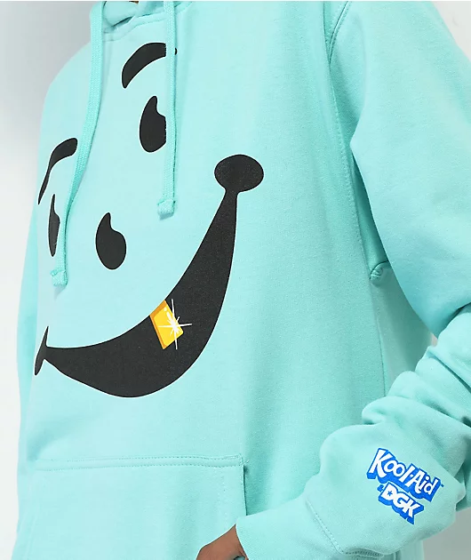 An official collaboration between DGK x Kool-Aid brings you the Thirst Hoodie in a mint colorway. Featuring a screen-printed graphic of the Kool-Aid man’s face on the chest, with a shiny golden tooth that draws the eye, contrasting nicely against the mint