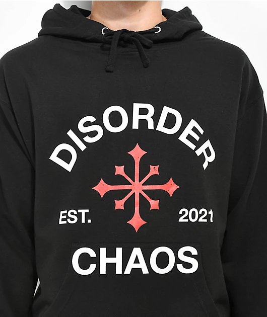 From Nyjah Huston’s Disorder Skateboards, the Est. 2021 hoodie comes in a timeless black colorway. The chest features bold logo branding, with \”Disorder | Chaos\” written in white. Made using a luxe cotton blend, the hooded sweatshirt is finished with a so