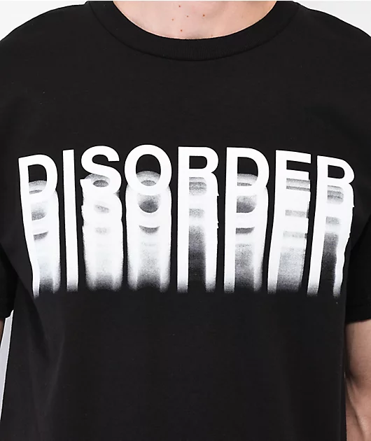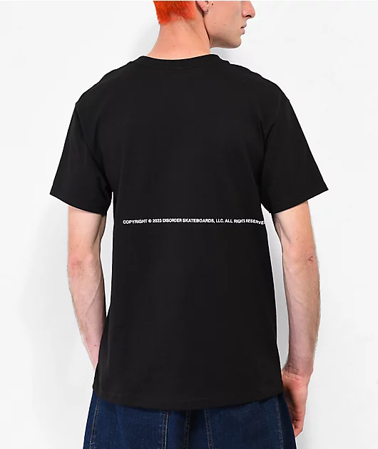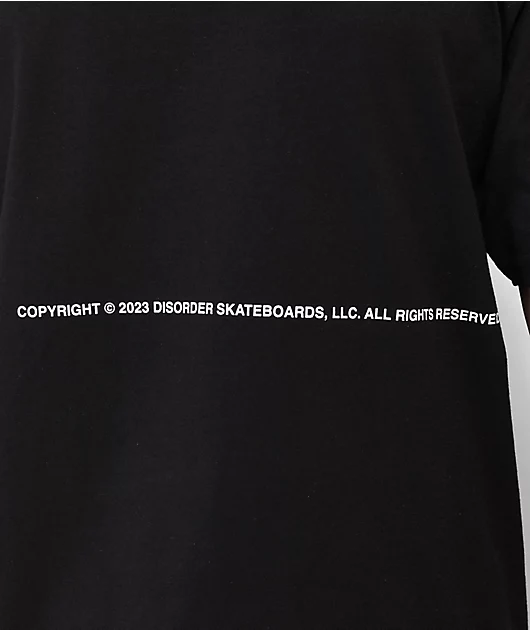 The Scan t-shirt from Disorder Skateboards comes in a soft, black cotton construction, and features Disorder logo script screen-printed across the chest in white, fading font.