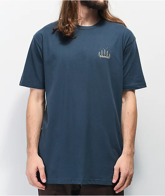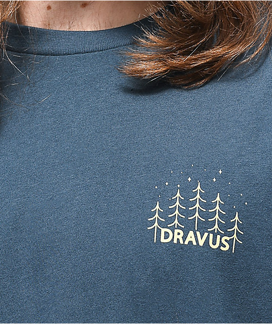 Make sure you’re ready for what awaits you with the Adventures Await indigo t-shirt from Dravus. This dark blue tee features a Dravus logo script at the left chest along with a few trees, while the back features a graphic of a minivan driving through the