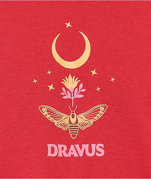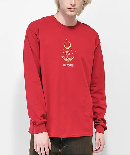 The Chaos Magic Dravus t-shirt comes in a long sleeve construction with a burgundy colorway boasting a screen-printed graphic on the left side of the chest of a moth and the moon. On the back is a larger version of that graphic featuring two moths and scr