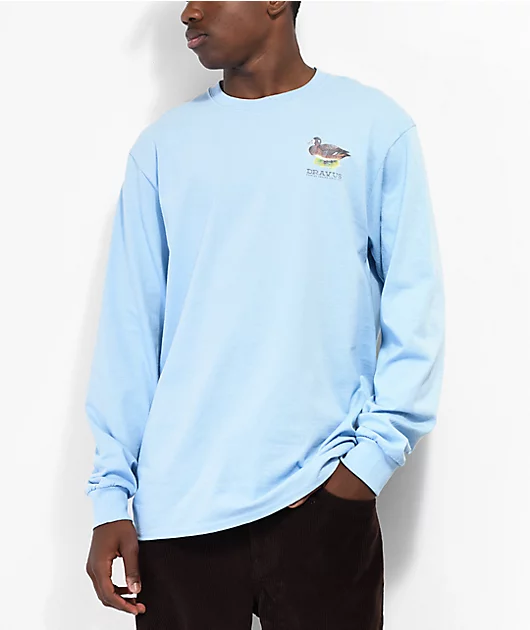 The Dravus Ducking around long sleeve t-shirt comes in a light blue colorway, showing off the brand name left of chest along with graphics of various ducks on the back. This long sleeve tee is made from a midweight cotton, offering long-term comfort with