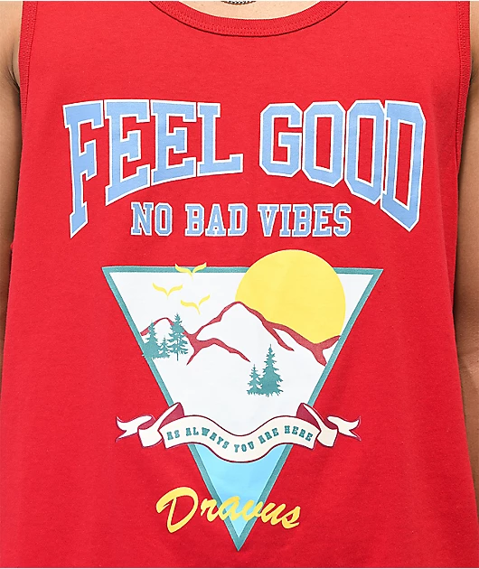 The Feel Good tank top by Dravus is constructed from lightweight, breathable cotton, and comes in a cardinal colorway. The screen-printed graphic of this Dravus tank top is a mountainous scene and text reading, \”Feel good|No bad vibes.\”