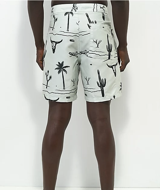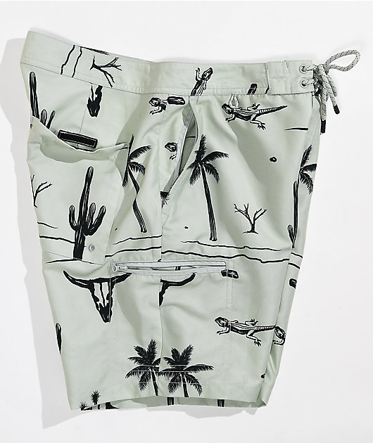 The Goff 18\” board shorts from Dravus come in a mint colorway with black sublimated graphics of desert animals and plants including lizards and cacti. These shorts feature an elastic waistband with two adjustable drawstrings for a comfortable fit as well