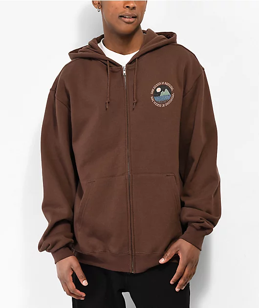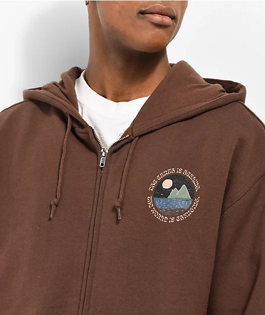 From Dravus comes the healing Earth hoodie in a brown colorway, offering easy pairing with other styles thanks to a full zip closure and storage with dual slash hand pockets. This hooded sweatshirt shows off a screen-printed graphic left of a serene lands