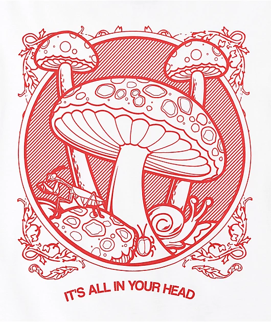 Freshen your graphic tee game with the In Your Head white long sleeve t-shirt from Dravus. This long-sleeve tee comes in white and features bold red mushroom graphics at the chest with text that reads \”It’s All In Your Head.\”
