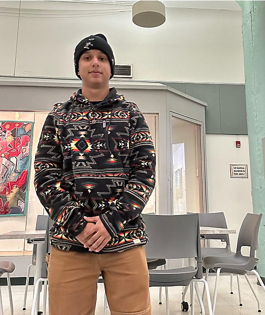 Don’t let the cold bring you down with the McKinley black geo print tech fleece jacket from Dravus! This hooded jacket features an exceptionally warm faux sherpa material, and geometric print detailed throughout for bonus style points. The jacket also has
