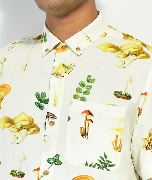The Neat Nature Dravus shirt comes in a short sleeve button up construction made of 100% rayon for a sheer effect. This shirt has a sand colorway with sublimated graphics of mushrooms throughout and features a patch pocket on the left side of the chest fo