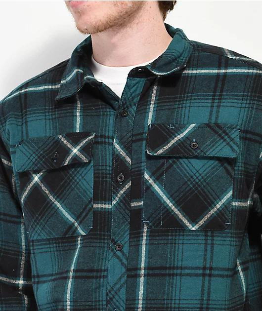 The Dravus Sherpa jacket comes in a black and green flannel construction, with an insulated design. The cozy sherpa-lined shacket features traditional fold over collar with a button up closure, while dual hand and chest pockets finish the cold weather loo