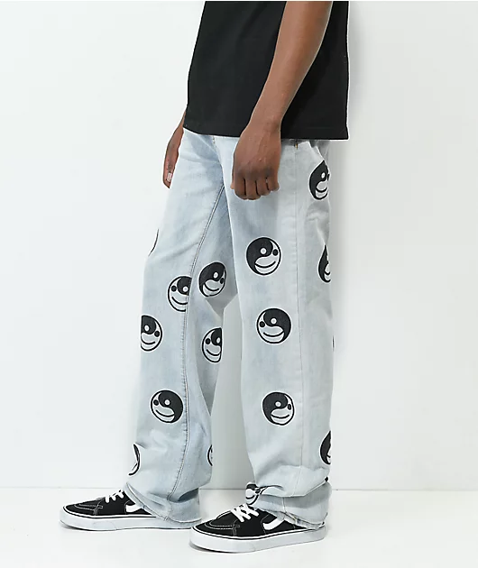 From Dript Denim comes the Peace Smile wide leg jeans in a light blue wash, with screen-printed graphics of smiling yin-yang symbols throughout. These jeans find perfect balance with its loose but tapered silhouette, and they are accented by the orange st