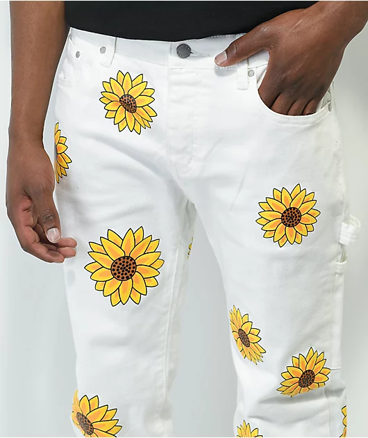From Dript Denim come the Sunflower carpenter skinny jeans. The Dript denim pants have a white colorway with screen-printed sunflowers throughout. They have the standard 5-pocket configuration, as well as a carpenter pocket on each thigh, and a hammer loo