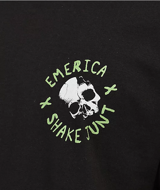 Emerica collaborates with Shake Junt for the Skull t-shirt, in a black cotton construction. An image of a skeleton appears on the back with green \”Emerica | Shake Junt | Get buck!\” text, while a small skull appears on the left chest.