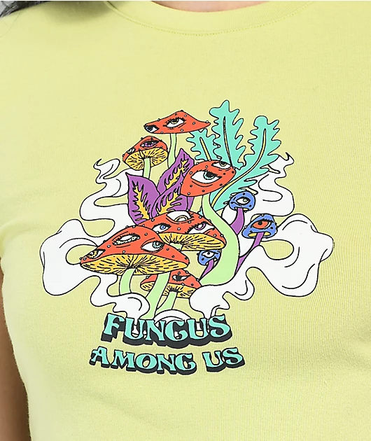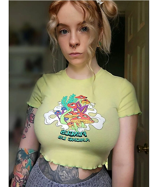 The Angelica Empyre crop t-shirt has a ribbed construction and is made from a soft, breathable cotton and polyester blend, with added spandex for a stretchy, form-fitting fit. This Empyre crop top comes in green with screen-printed mushrooms and \”Fungus a