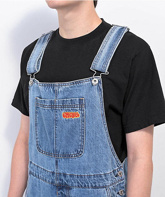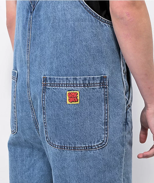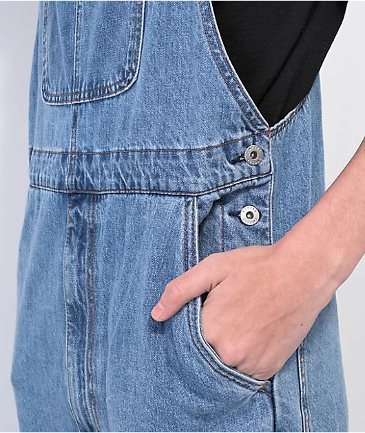 The Blake skate overalls come in a light wash denim construction, offering a custom fit with adjustable shoulder straps. A split pocket on the chest provides storage, along with a 4 pocket configuration; showing colorful branding left of chest and on the