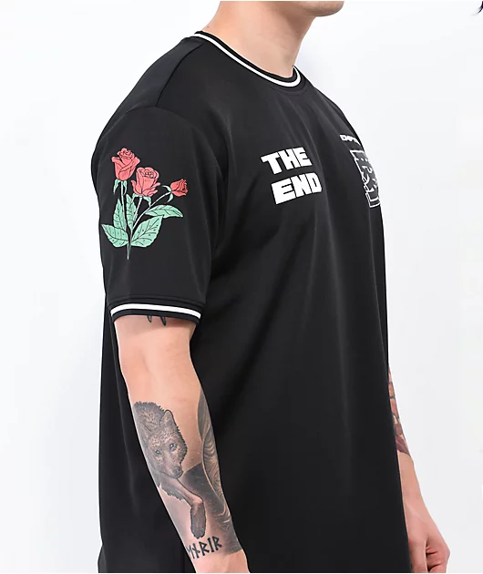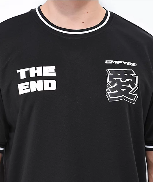 In a black colorway comes the Blue Steel soccer Jersey from Empyre, showing off script right of chest in white that reads \”The End\”, with Japanese lettering set below the brand name left of chest. A splash of color in green and red can be found in the scr