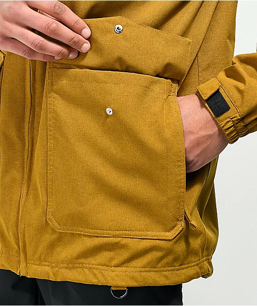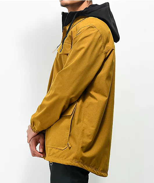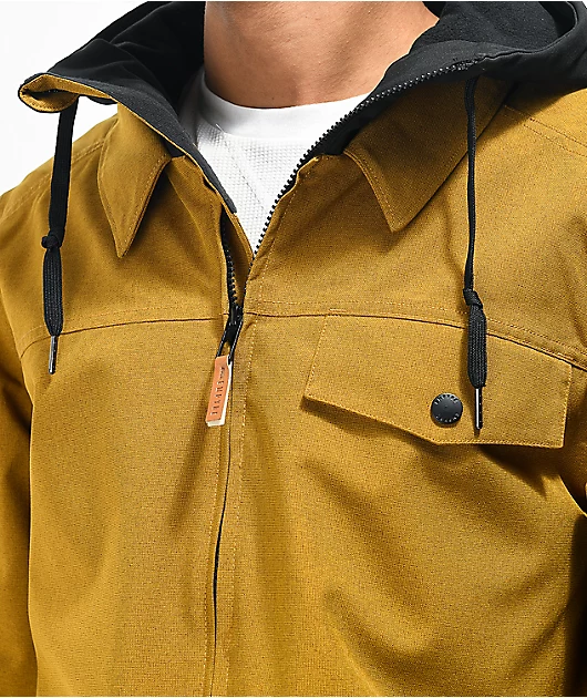 Employ some streetwear-style to your mountain gear with Empyre’s Bobber tan and black 10k snowboard jacket! This jacket has a coaches jacket silhouette in a dark, yellowish tan, with a black adjustable hood for modifiable comfort. Since this jacket’s not