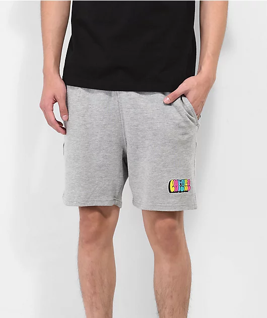 The Empyre Bubble Letter sweat shorts come in a grey colorway, with a colorful brand graphic screen-printed graphic on the left leg. Made of cozy 60% cotton, 40% polyester, the Empyre shorts are finished with a ribbed drawstring waistband, a brushed inter