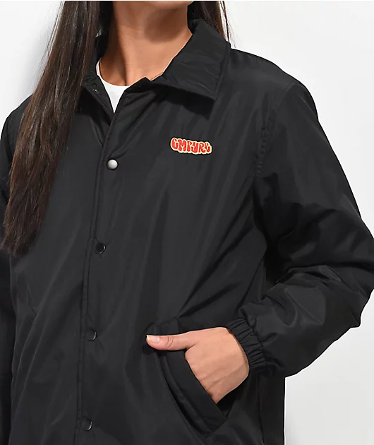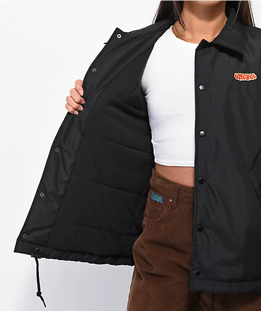 In a black colorway comes the Cella filled coaches jacket from Empyre, showing colorful brand embroidery left of chest. This lightweight winter coat offers a traditional look with a turndown collar and easy layering with a full button closure. Storage can