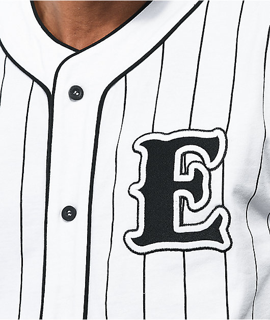 Pick up a striking, sporty look in the Empyre Chuck white and black pinstripe baseball jersey! This white jersey sports black pinstripes for an authentic look, while the large E at the left chest adds some fun branding to the aesthetic.