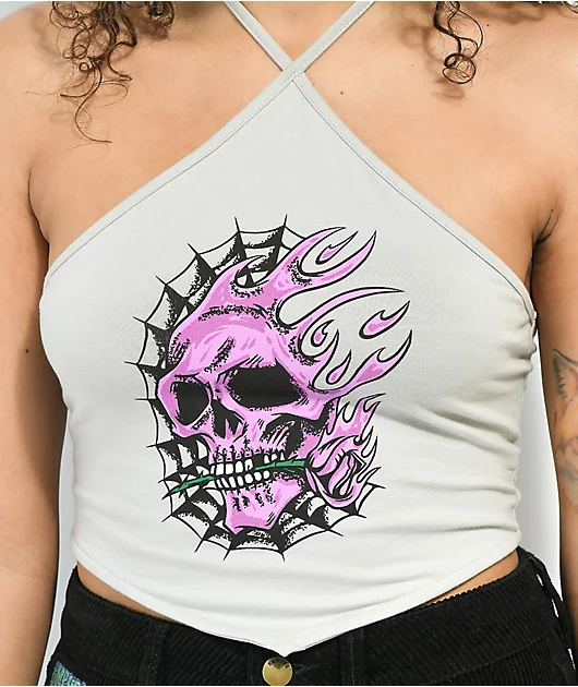 With a grey halter top construction, the Devon tank top from Empyre features a graphic of a flaming purple skull holding a rose between its teeth. The Empyre halter top is made of a stretchy cotton blend, has thin adjustable straps with a v neckline, and